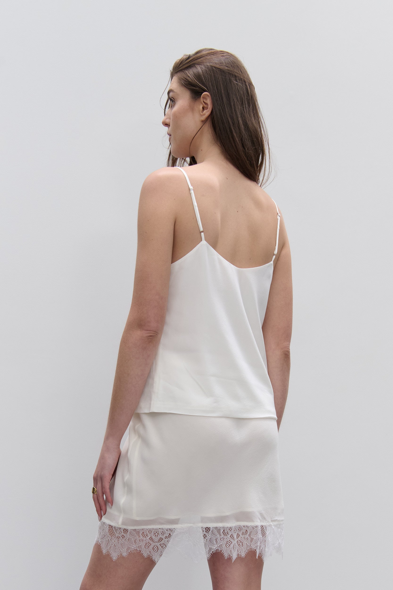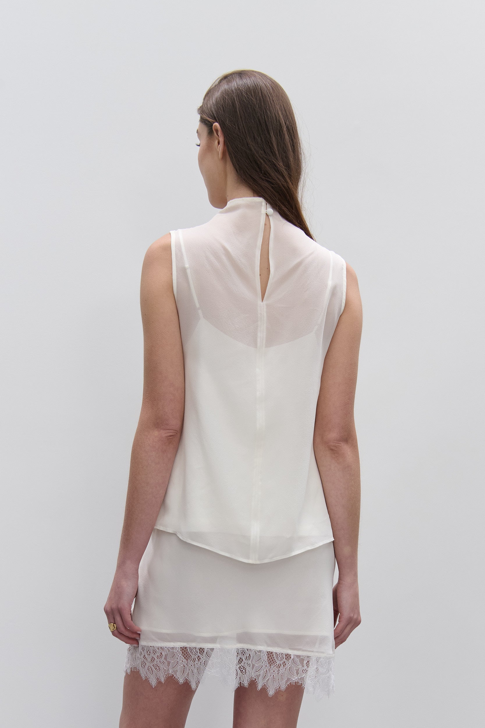 high neck, silk georgette sleeveless top with seam detailing, back keyhole and button closure. style comes paired with matching silk crepe camisole with adjustable straps