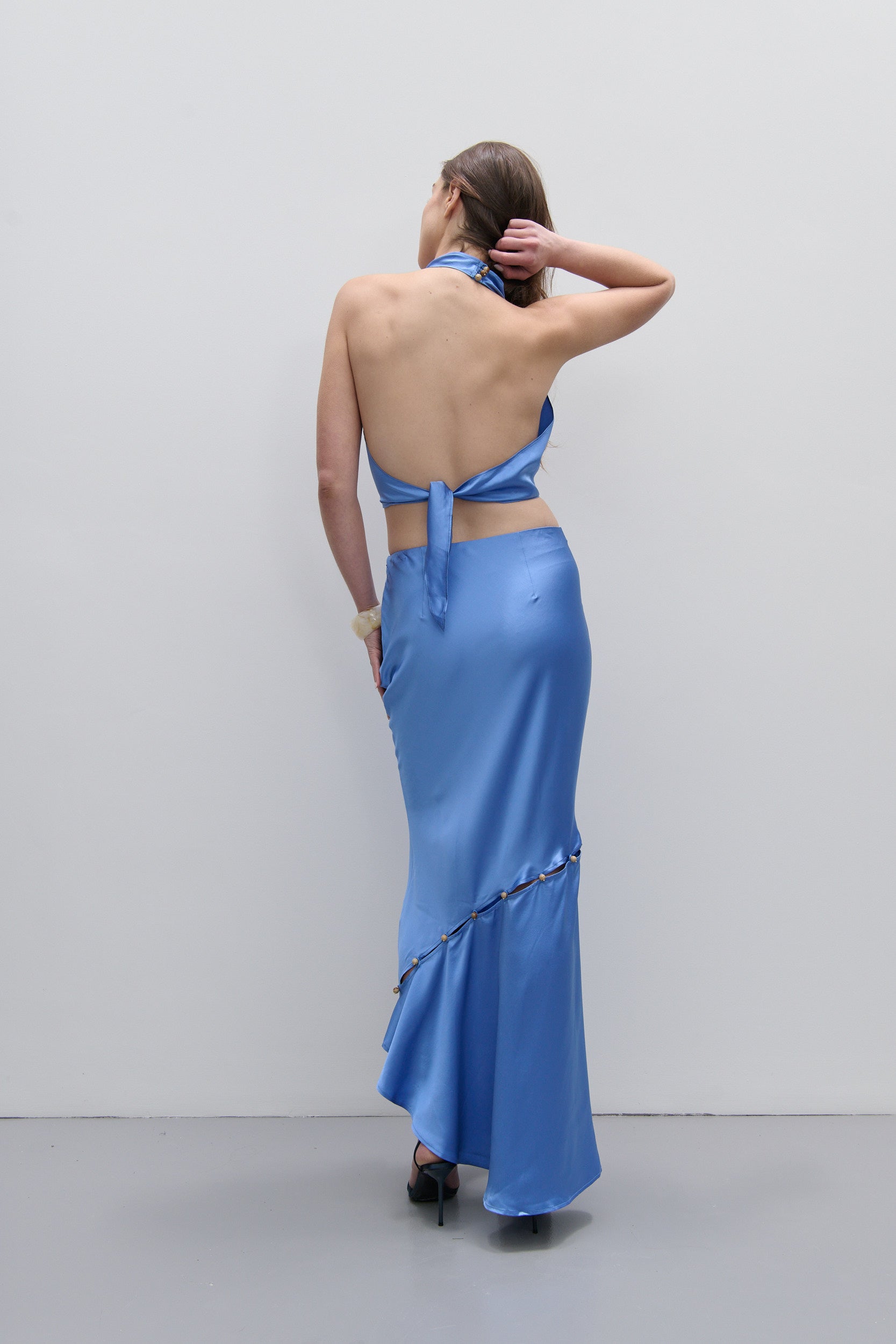scarf inspired halter wrap top with 2 piece front, natural stone buttons at back neck and tie at back waist. paired with devin skirt in regatta.