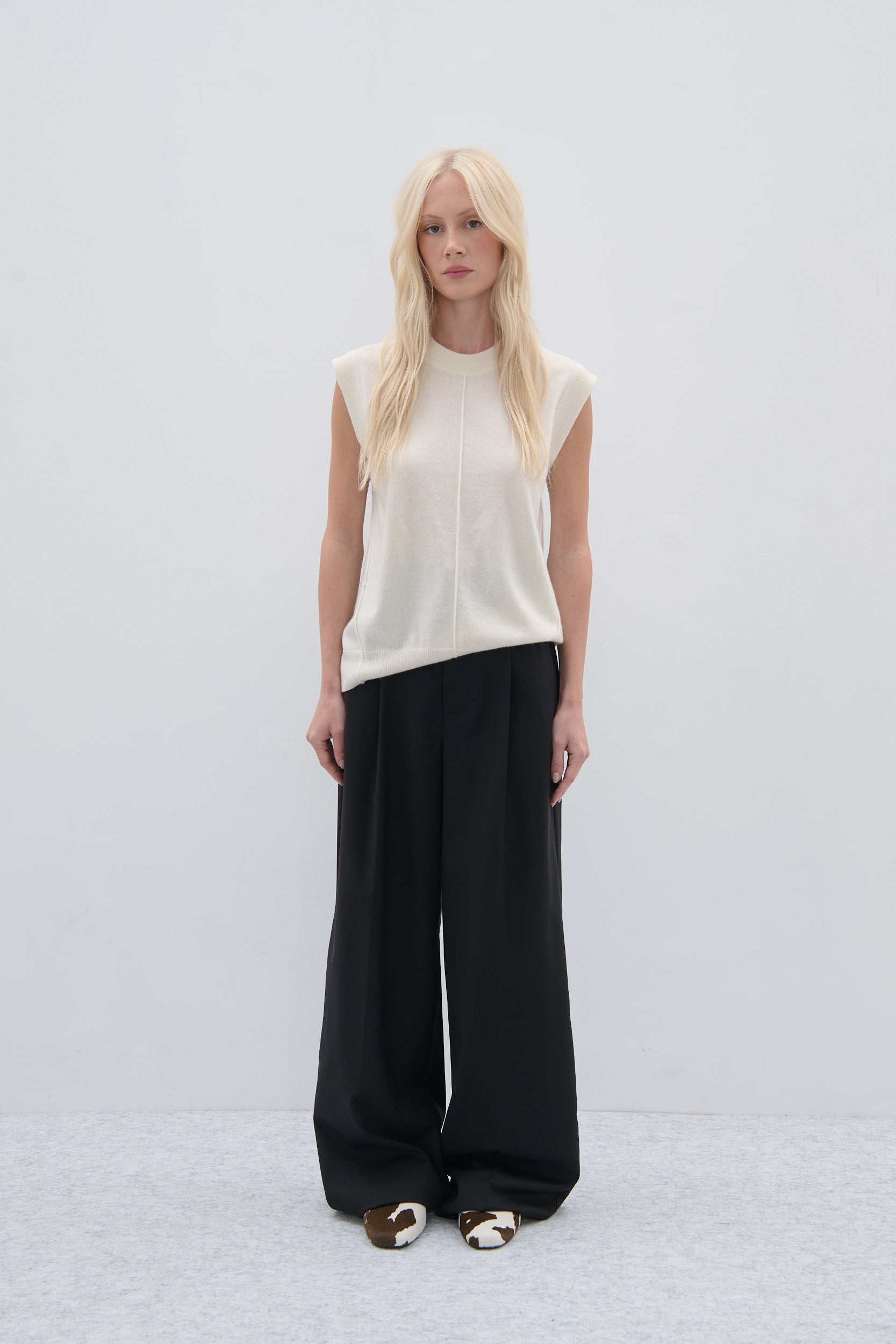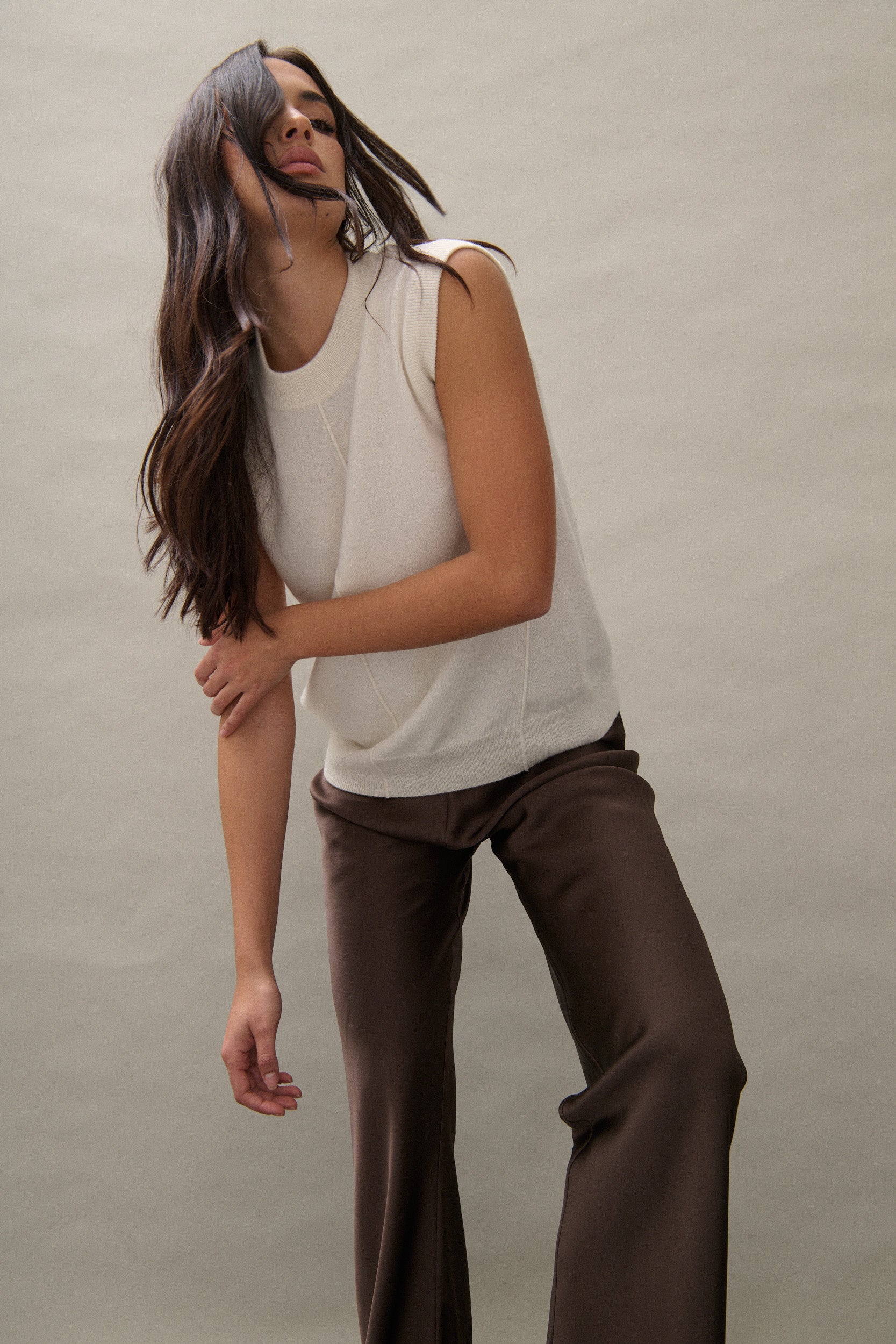 cashmere knit vest in cream with rib hem and exposed seam details
